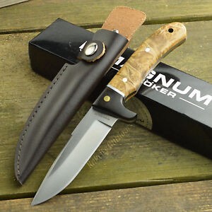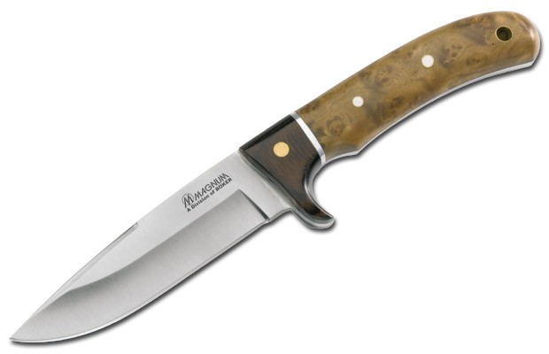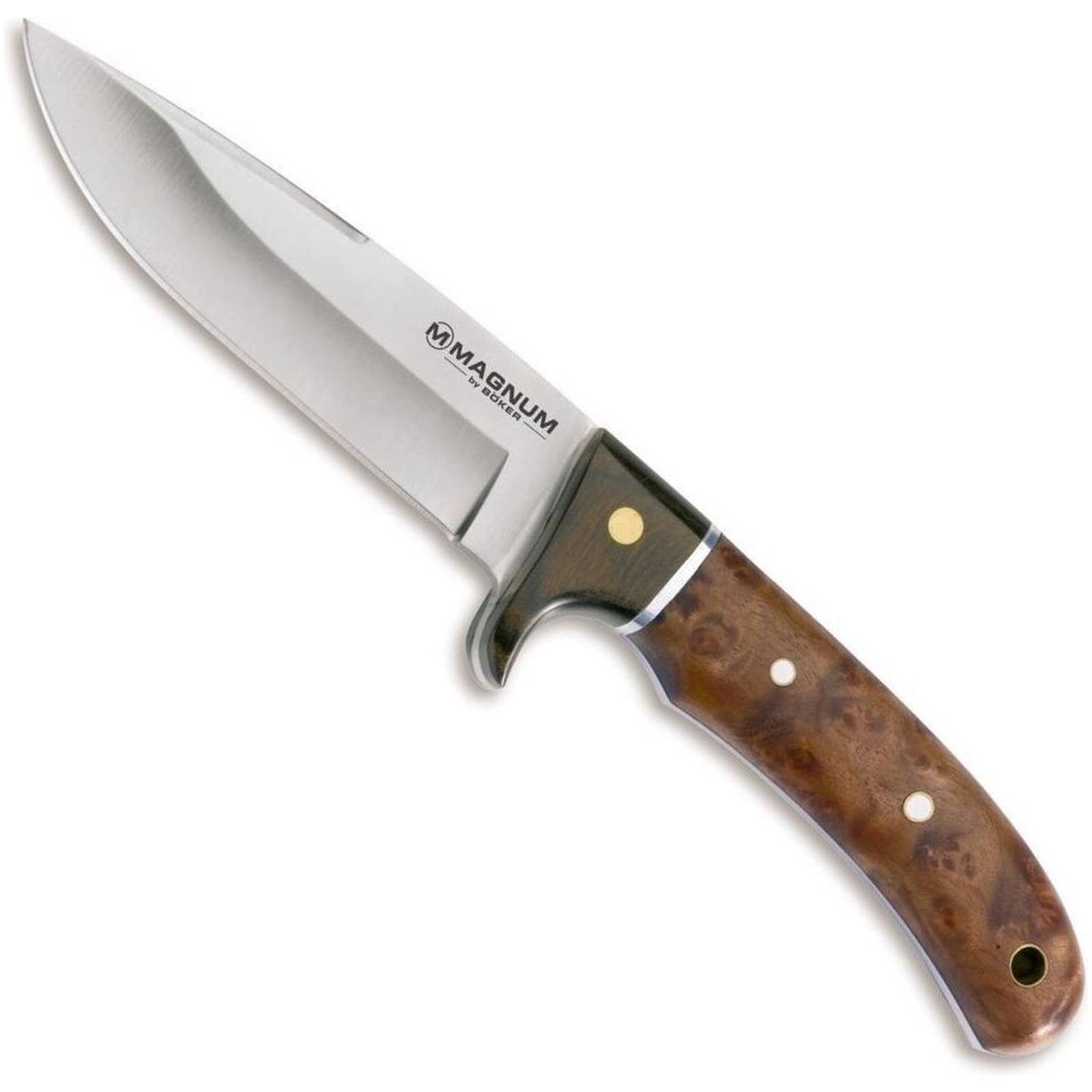 Osvědčený Magnum Elk Hunter přesvědčí svou ideální délkou čepele jak ve volné přírodě, tak v každodenním životě. Optika a funkce charakterizují tvarovaný cestovní nůž s nerezovou čepelí 440A, který je opatřen saténovou povrchovou úpravou a je jemně broušen. Podlouhlá falešná ostrost na zadní straně čepele dává noži moderní vzhled. Robustní konstrukce Vollerl je vybavena ergonomicky tvarovanými rukojeťmi z tropického palisandru, které mají extrémně hladký povrch díky svým jemným pórům při zpracování. Výrazná ochrana rukou v oblasti označených čelistí a hluboké vybrání prstu zabraňují nežádoucímu sklouznutí na čepel a tím zvyšují bezpečnost práce. Pomocí vyztuženého otvoru pro šňůrku na konci rukojeti lze k noži připevnit provázek nebo přívěsek. Dodává se s praktickým koženým pouzdrem, které je zajištěno tlačítkem a lze jej pohodlně připevnit na opasek.