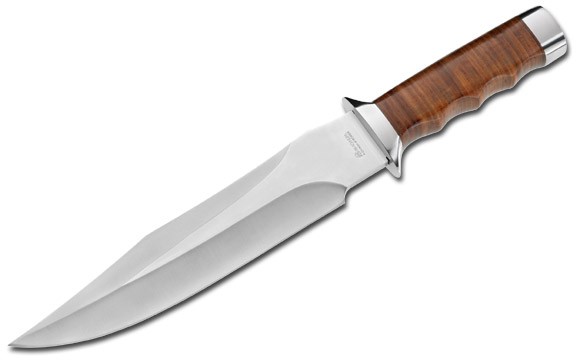 Nový výklad legendárního stylu Vietnam Bowie, s impozantnímy rozměry. 440 nerezový nůž se vyznačuje precizním broušením a je extrémně ostrý. Kryt a hlavice jsou vyrobeny z leštěné nerezové oceli a pravé kůže.Rukojeť s rýhamy na prsty umocňuje celkový vzhled tohoto klasického díla.