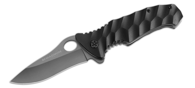 Výkonný nůž pro práci i volný čas. Vlnitý tvarovaný grip z hliníku a potažený titanem. 440 nerezový nůž.