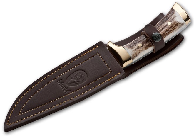 Střenka rukojeti z jeleního paroží. Saténově upravená čepel je vyrobena ze španělské oceli MOVA, molybdenu vanad oceli s tvrdostí 57 až 61 HRC Rockwell. Dodáváno s koženou pochvou.