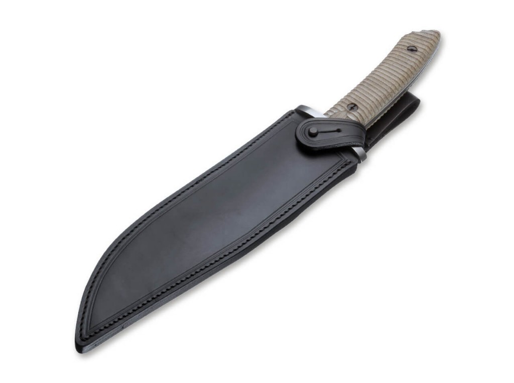 Pevná konstrukce v kombinaci s klasickým vzhledem a vysokou užitnou hodnotou dělají z Boker Arbolito El Gigante vynikajícího společníka do přírody a na lov. Nezničitelné rukojeťové šupiny vyrobené ze zeleného plátěného micarta mají dodatečnou drážkovou strukturu, a proto je z hlediska úchopu těžko překonat. Moderní vzhled materiálu v kombinaci s mimořádně praktickou úpravou stonewash dělají z Bowie mimořádný nůž nejen pro použití, ale i pro sběratele. Pevná čepel z oceli Böhler N695 prochází celou rukojetí a zužuje se směrem ke konci rukojeti. Takzvaný Tapered Tang dodává Hirschfangeru zvláštní vizuální nádech a dokonale ho vyvažuje. Rozložitý a pevný chránič ruky z broušené nerezové oceli slibuje vysokou bezpečnost práce a přispívá k elegantnímu vzhledu. Dodáváno s vysoce kvalitním černým koženým pouzdrem.
