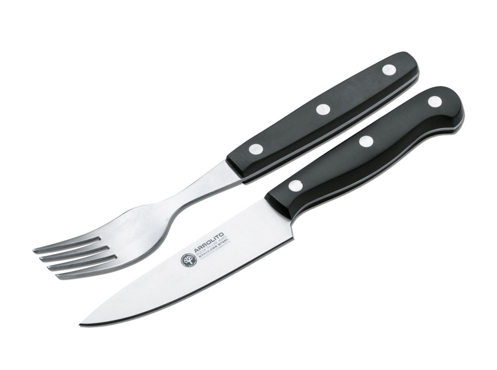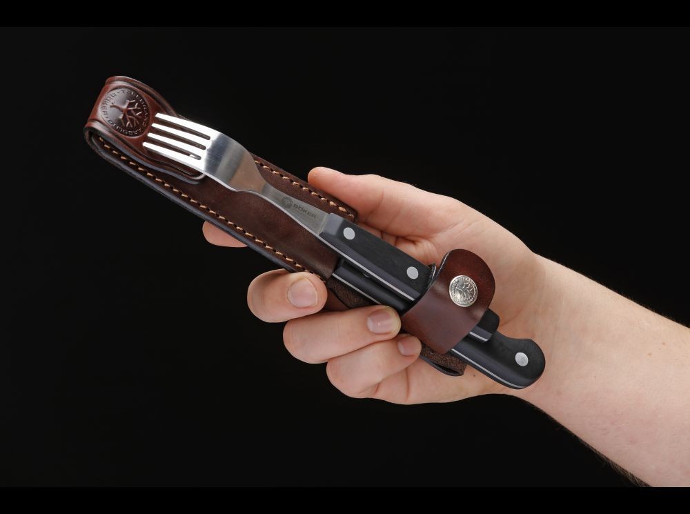 Sada příborů Boker Arbolito Salida se skládá z nože a vidličky, které jsou umístěny společně v kvalitní kožené pochvě. Praktická sada, která je kompletně ručně vyrobená v Argentině, se skvěle hodí na venkovní vaření, pikniky a podobně. Namísto malého steakového nože běžné sady Salida přichází tato verze s o něco větším plochým broušeným nožem, který je také velmi vhodný pro přípravu jídel. Rukojeť je vyrobena z černého POM.