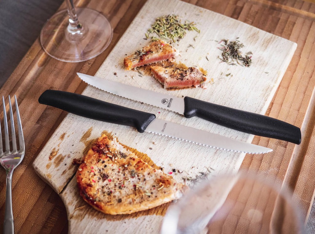 Sada dvou všestranných steakových nožů s vysoce kvalitní čepelí z nerezové oceli s ostrým zoubkovaným ostřím pro dokonalé řezání. Černé syntetické rukojeti bezpečně drží v ruce.