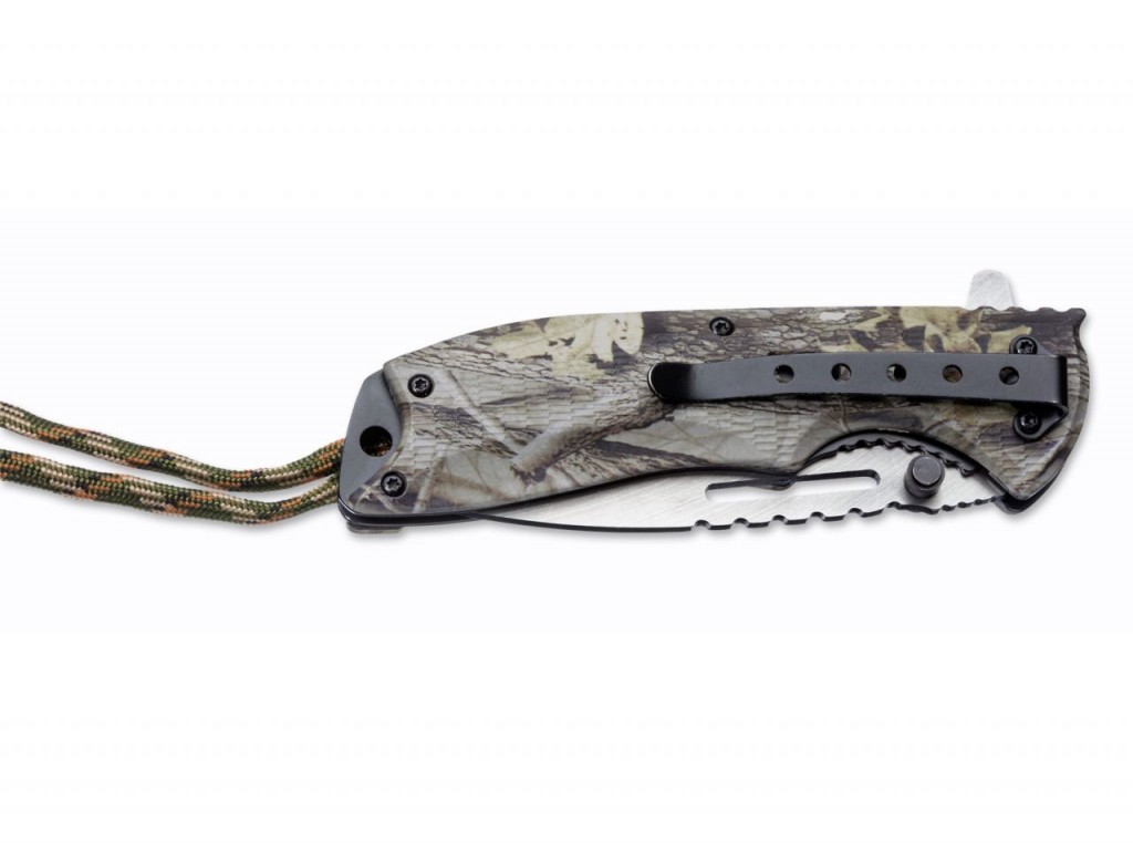 Úžasně lehký kapesní nůž, zvláště ve vztahu k rozměrům! Čepel 440A má atraktivní dvoubarevnou povrchovou úpravu. Uzávěr zajišťuje bezpečnost. Rukojeť je opatřena plastovými střenkami s mimořádným maskovacím vzorem. Včetně šňůrky a klipu.