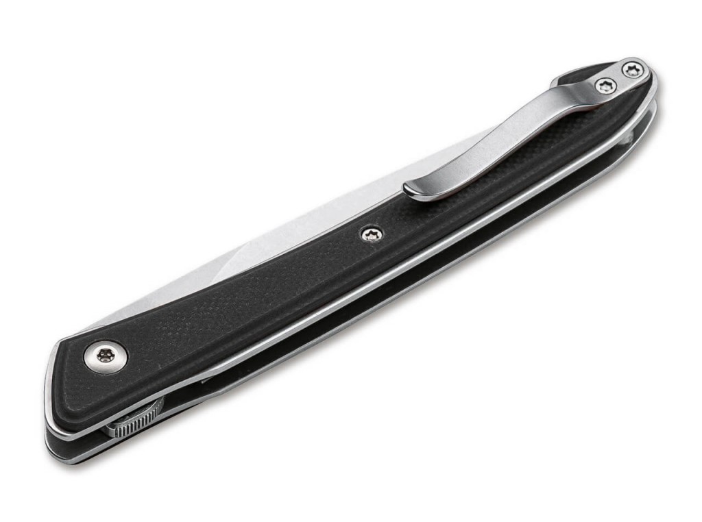 Téměř jemný Boker Plus Spillo je určitě jedním z nejkompaktnějších gentlemanských nožů v našem sortimentu, který mírně připomíná moderní steak nůž. Má plochou čepel VG-10, která se otevírá pomocí ploutve. Přestože čepel na kuličkových ložiskách přesahuje jen nepatrně za štíhlou rukojeť, potřebuje k rychlému a pohodlnému otevření jen malý tlak. Černá rukojeť s texturou G10 obklopuje robustní linerlock. S odnímatelným klipem (výklopným).